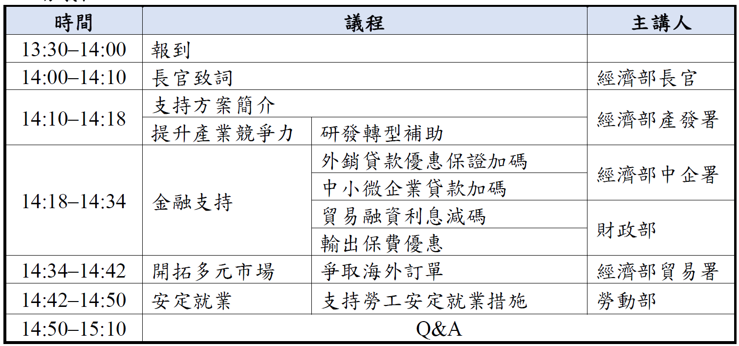 一、活動目的:為即時協助產業及國人因應美國關稅衝擊,增進我國經濟發展動力及國際競爭力,行政院依「因應國際情勢強化經濟社會及民生國安韌性特別條例」,推動各項產業支持方案,為使更多業者瞭解各項措施內容,經濟部特辦理聯合說明會,就提升產業競爭力、金融支持及開拓多元市場等面向進行說明,協助業者申請運用,且現場設置諮詢攤位,提供即時交流與諮詢,並同時提供現場直播。二、指導單位:經濟部三、主辦單位:經濟部產業發展署四、協辦單位:財政部、勞動部、經濟部中小及新創企業署、經濟部國際貿易署五、執行單位:財團法人中衛發展中心六、參加對象:相關產業公協會及企業代表七、活動時間及地點: